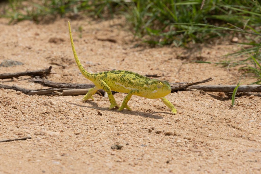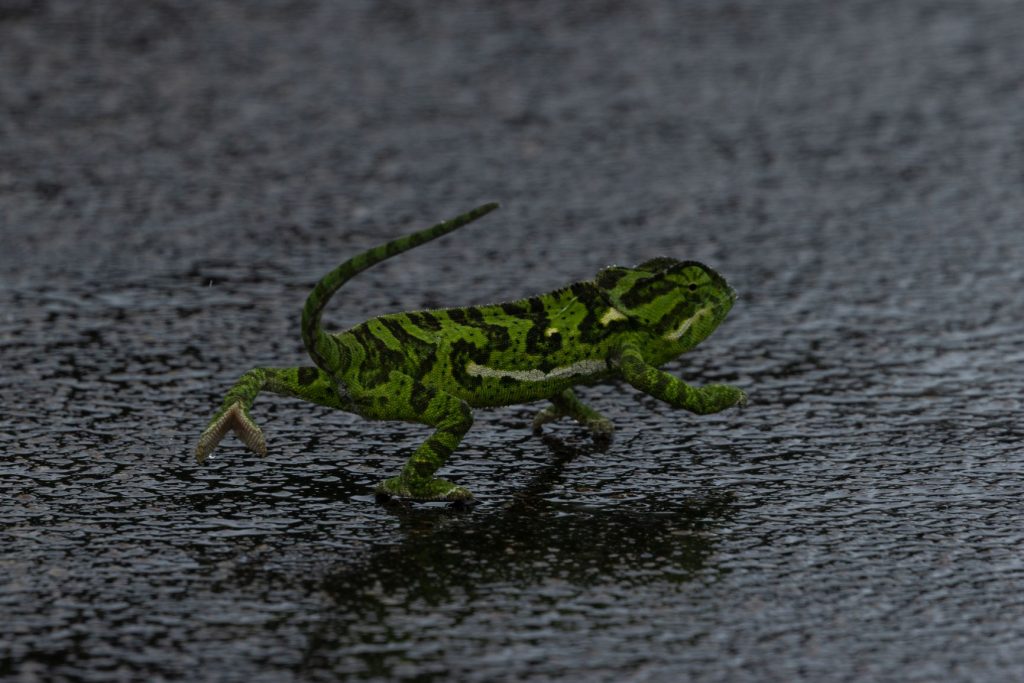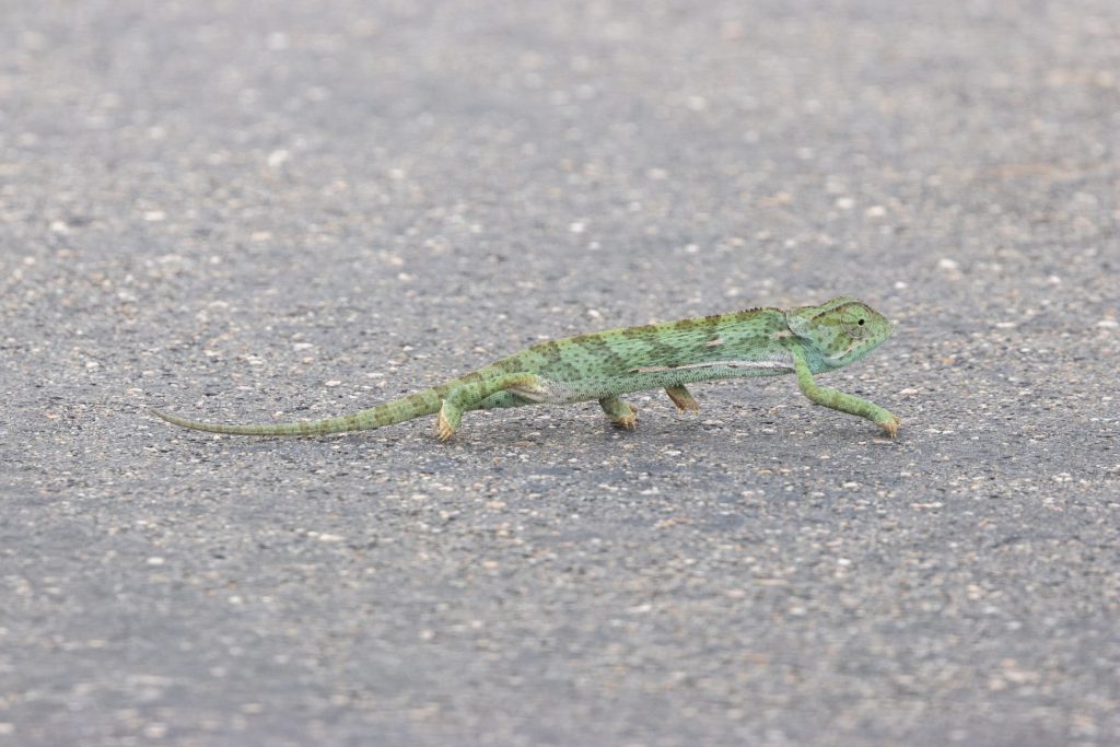 De kameleon heeft trouwens een heel typische loop bij het oversteken, dat kun je goed zien in onderstaand filmpje. En deze gaat vrij snel, we hebben al kameleons gezien die veel langzamer bewegen.