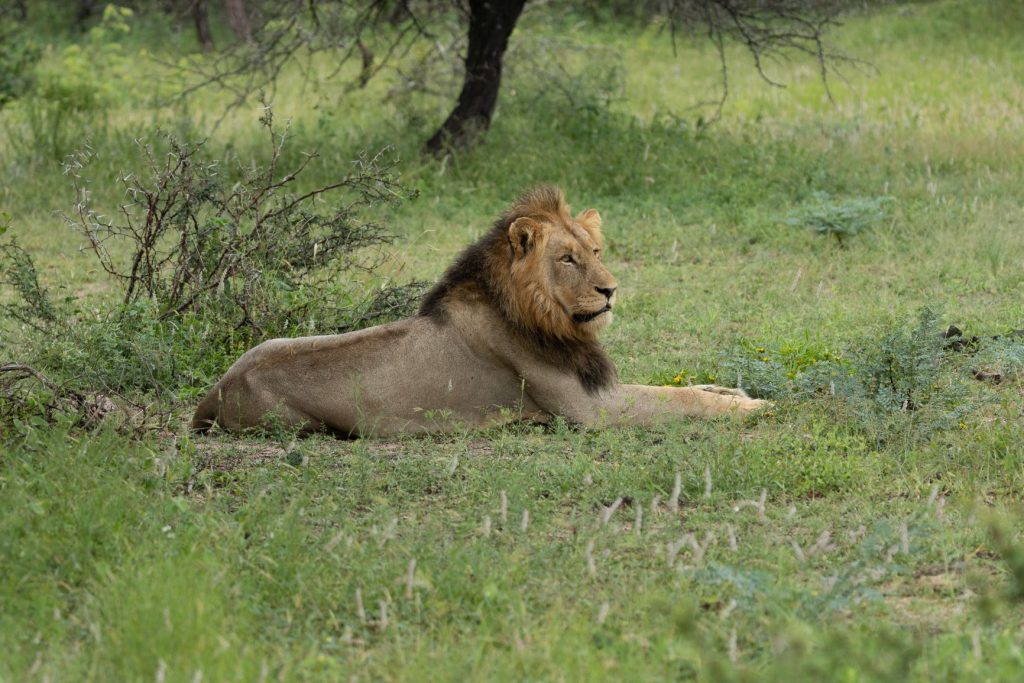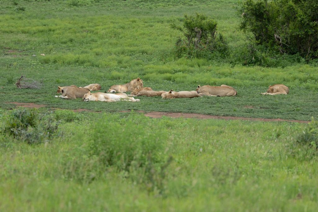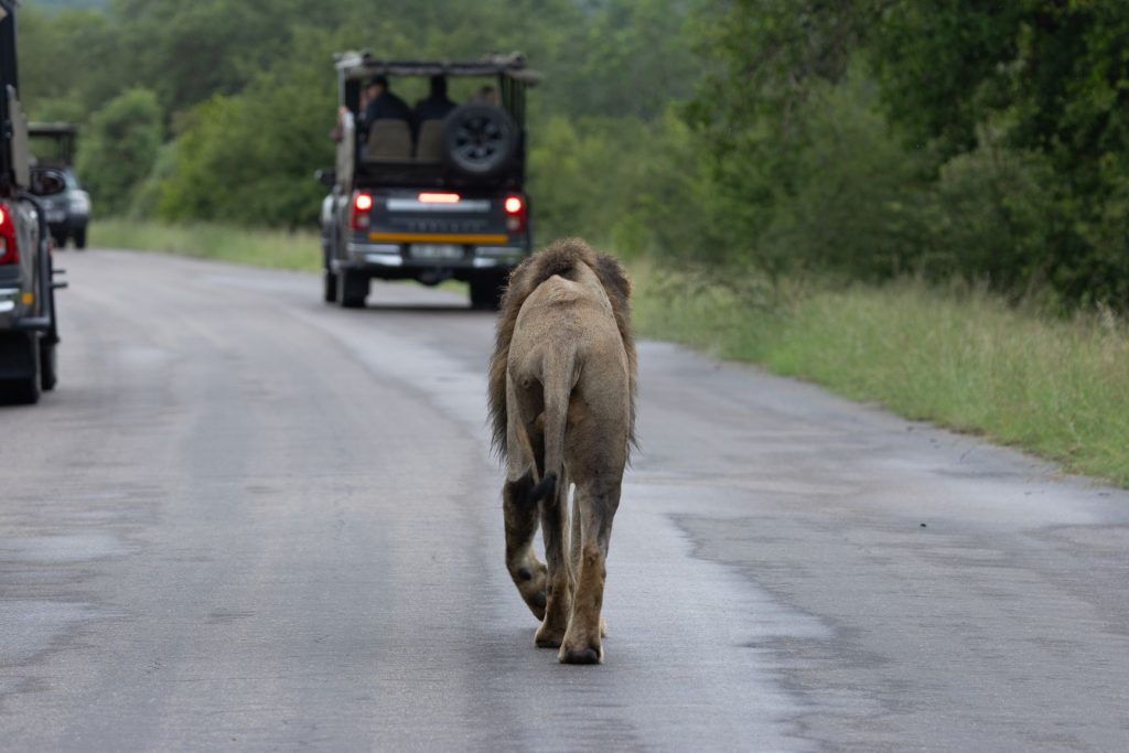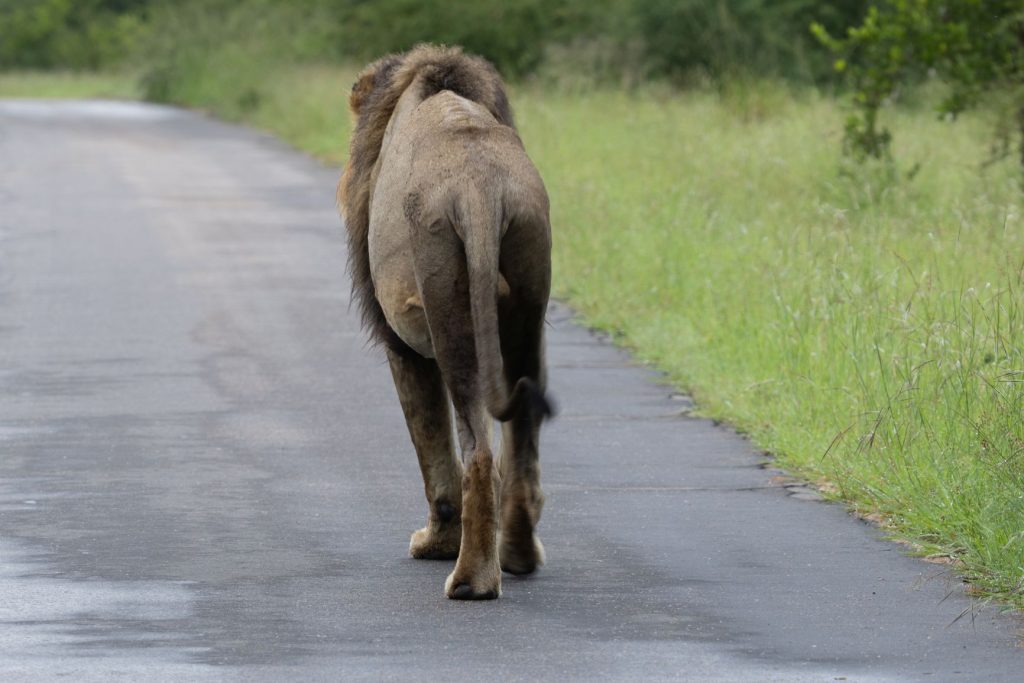 De volgende dag zouden we terug naar huis rijden, maar eerst wilden we weer een vroeg rondje rijden. We kwamen eerst weer de hyena’s tegen buiten de poort. De low-water bruggen waren nog gewoon hopen, hoewel het water hoger stond, maar ze overstroomden niet. Na een tijdje kwamen we een aantal OSV’s tegen. Een van hen zei ons of we de leeuwen niet gezien hadden. Ik keek in mijn spiegel en zag daar 2 leeuwen op de weg lopen. We zijn omgedraaid en met de OSV’s naar de leeuwen gereden. De OSV’s waren echter eerder en lieten mij er niet langs, zodat ik weer alleen een leeuw van achteren kon fotografen. De leeuw zag er slecht en mager uit. En de volgende OSV’s kwamen er al aan. We zijn daarom maar weer omgekeerd en verder gereden.