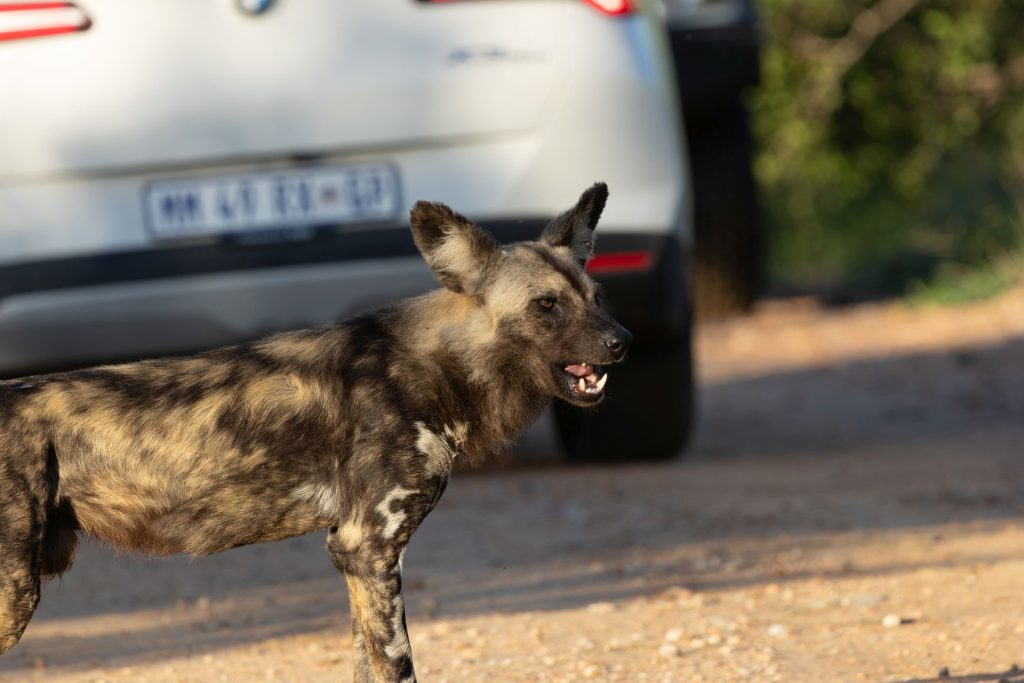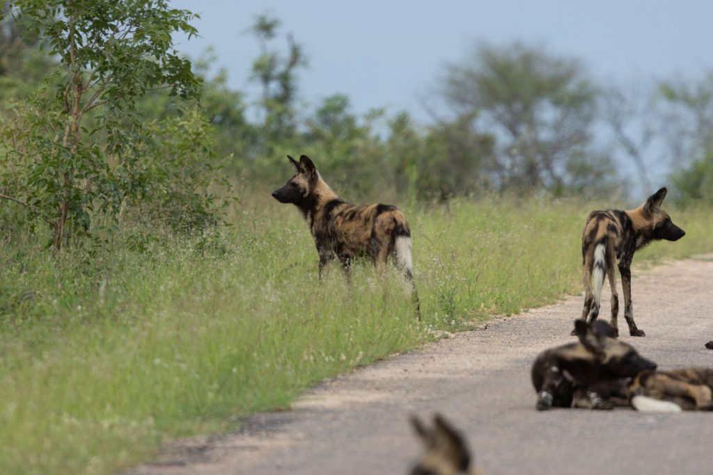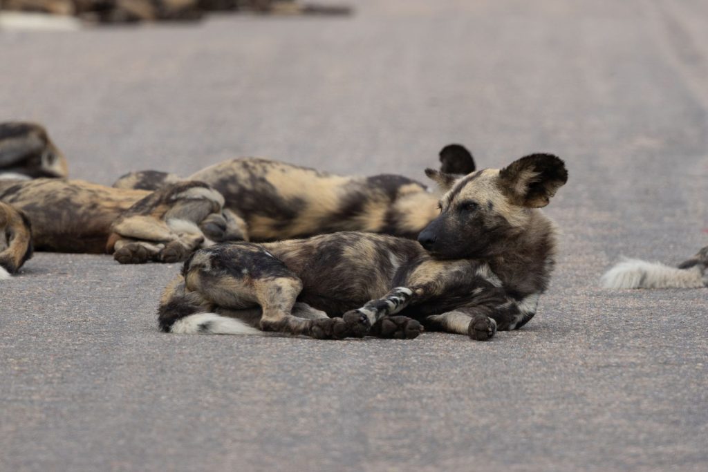 We zijn dezelfde weg teruggereden en besloten vervolgens via de hoofdweg richting Phabeni gate te rijden. Allereerst zagen langs deze weg een paar hyena’s en even later werd het nog beter, want er lag een hele troep wilde honden op de weg.