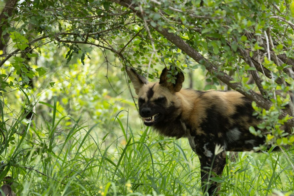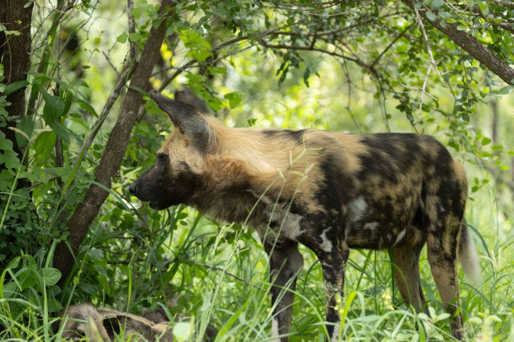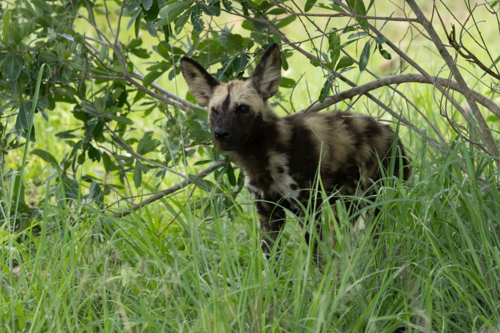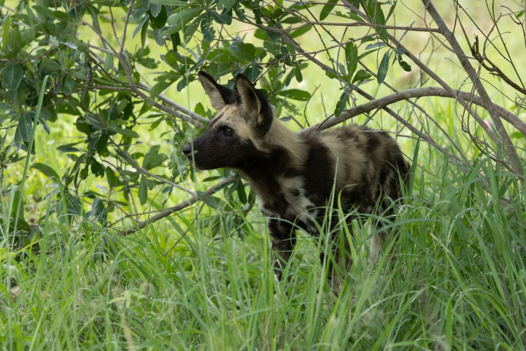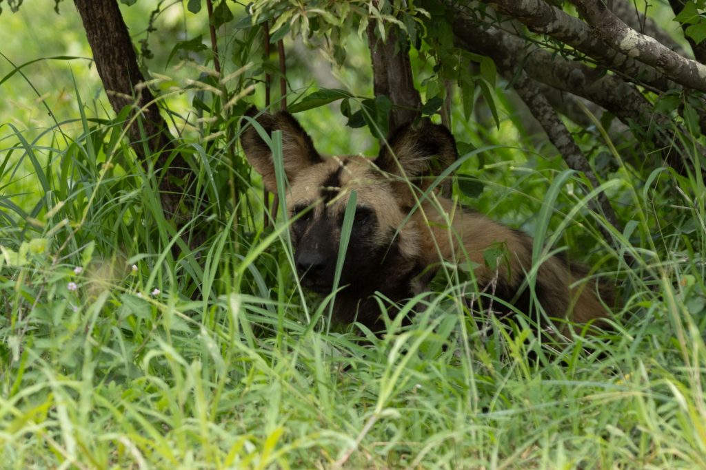 En al snel hadden we onze eerste interessante sighting, namelijk een aantal jonge wilde honden. Ze lagen onder een struik langs de weg, en daardoor konden we ze goed zien.