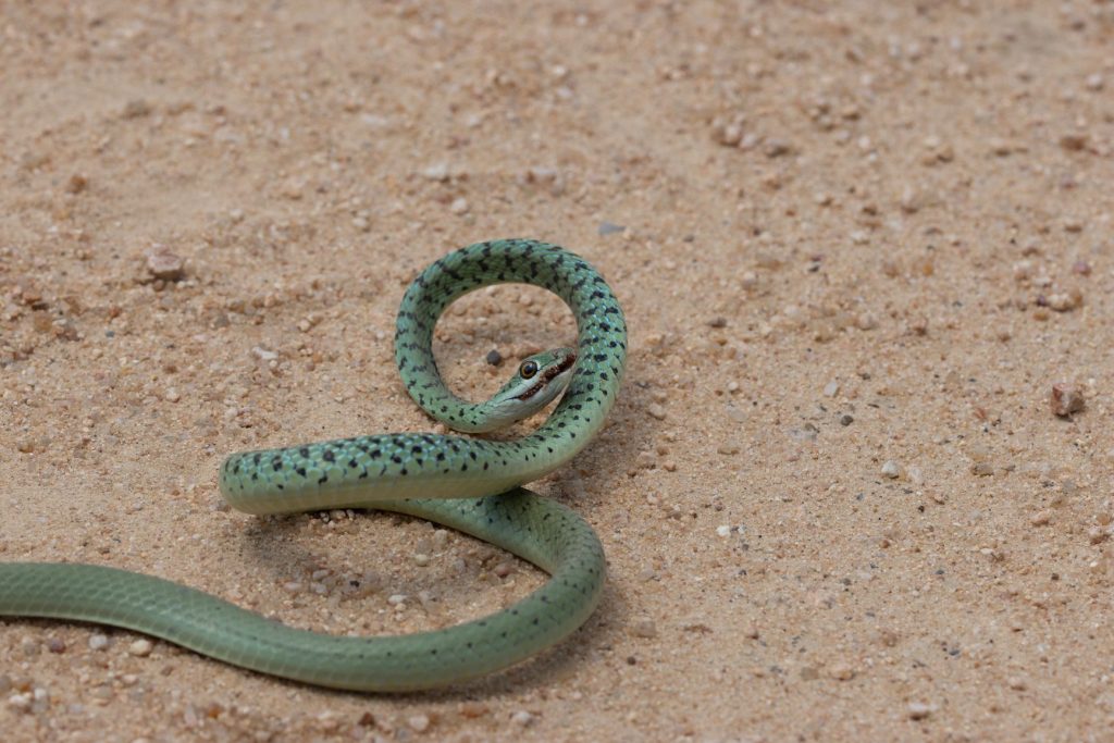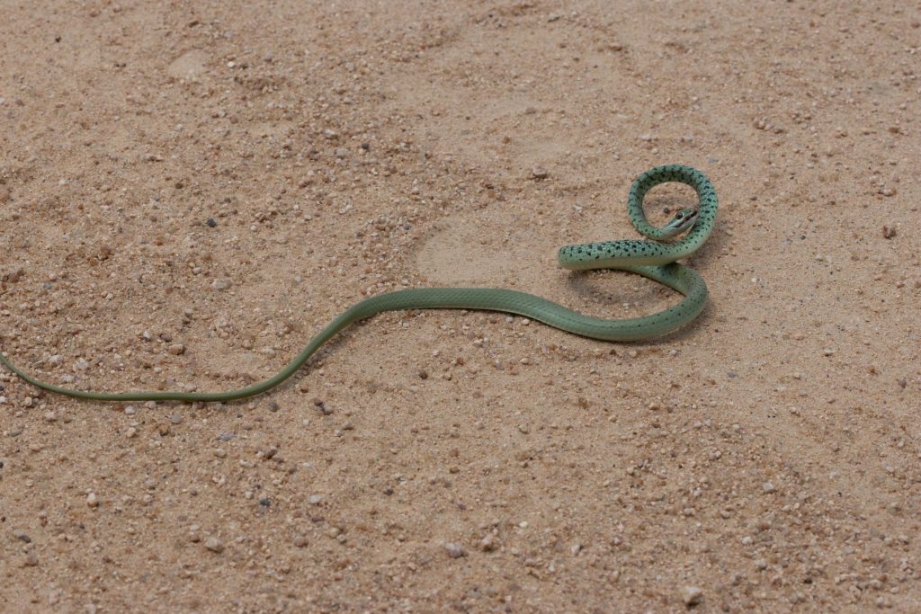 Ook kwamen we nog een slang op de weg tegen, een spotted bush snake, die verder ongevaarlijk is.