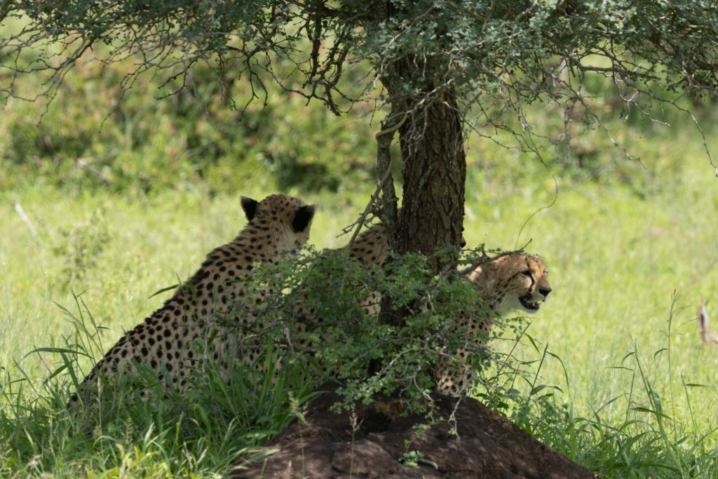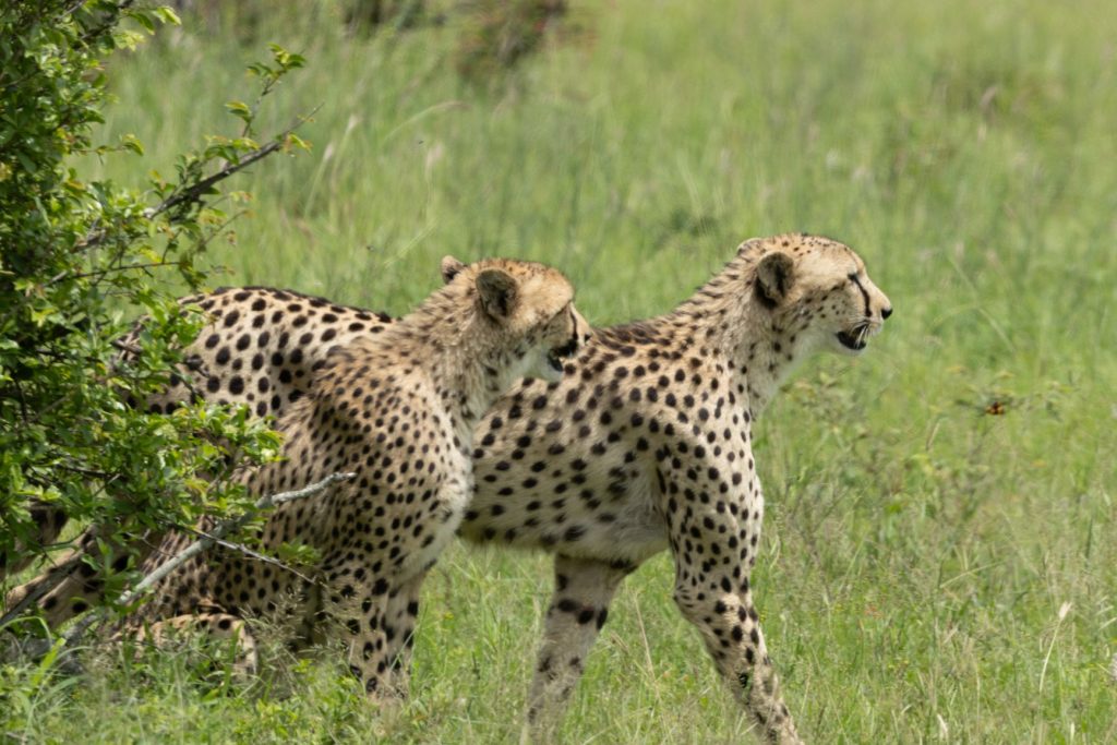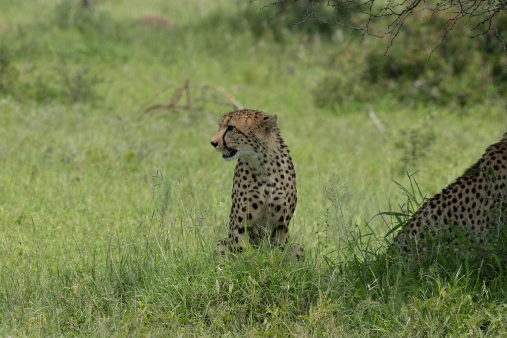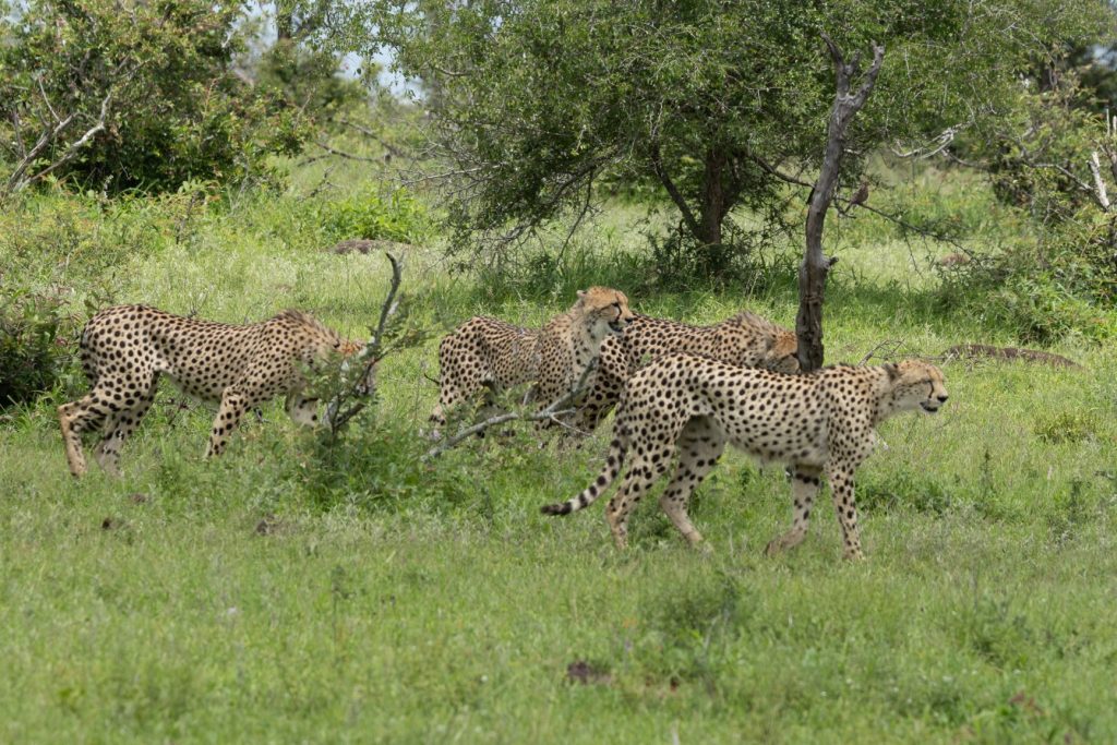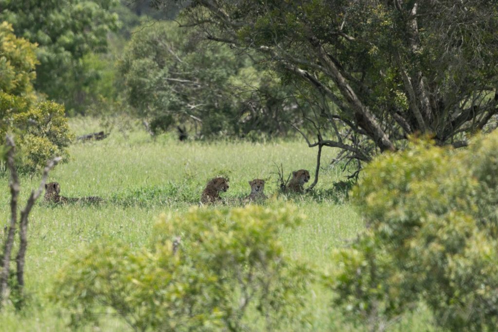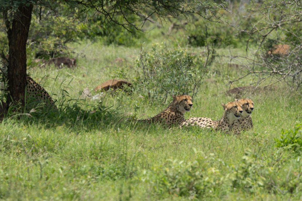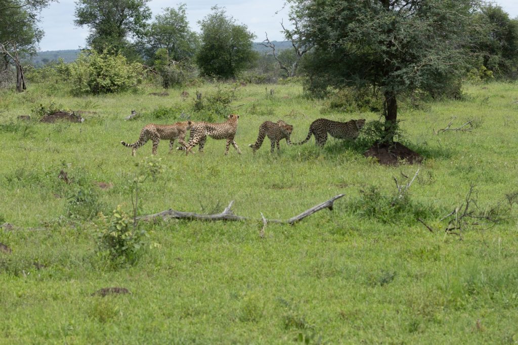 Na het ontbijt zijn we vervolgens richting Orpen rest camp gereden. Deze ligt naar het westen, en na dit kamp is er ook een toegangspoort, Orpen gate. Ongeveer 7 kilometer voor het kamp stonden er een aantal auto’s stil en we hoorden dat ze jachtluipaarden zagen (dat zijn cheeta’s voor ons). Ze liepen een stukje van de weg af, maar niet al te ver. We reden met de auto’s mee en zagen ze inderdaad lopen. Ik reed een stukje verder en stopte daar aan de kant, zodat ik ook vrij uitzicht zou hebben als ze langs lopen. Natuurlijk is er een kans dat ze ergens anders naartoe lopen, maar dat risico moet je nemen. En hadden wij even geluk, ze gingen precies waar wij stonden onder een boom stil staan en liggen. Daardoor kon ik goed foto’s nemen van de 4 cheeta’s.