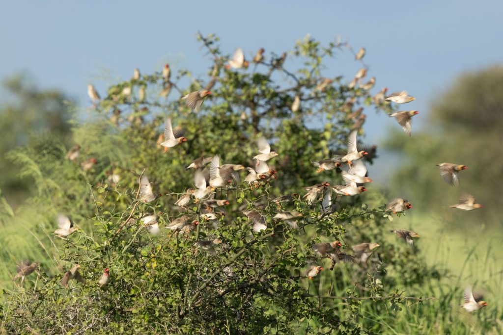 Wat we ook veel zagen, waren enorme zwermen kleine vogels die opvlogen uit de struiken wanneer wij langs kwamen. Het gaat om ‘red-billed quelea’ (roodbekwever). Deze vogel wordt algemeen beschouwd als de meest voorkomende vogel op aarde, aantallen worden geschat op 1,5 miljard individuen. Deze vogel kan ook grote schade veroorzaken voor de landbouw.