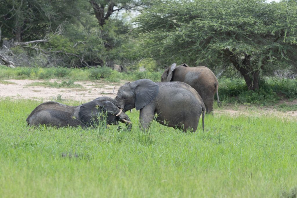Na een korte toilet stop bij Tshokwane, zijn we richting Nkhulu gereden. Dit is een picknick plaats aan de Sabie rivier. Daarvoor echter zijn we nog even bij de leeupan gestopt. Deze staat al een tijd droog, maar we zagen nog steeds geen water. Het bleek echter dat er wel een klein beetje water was, waarin 2 jonge olifanten aan het spelen waren: