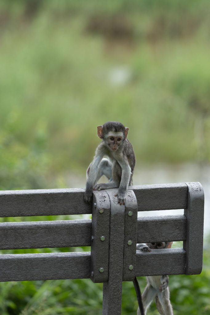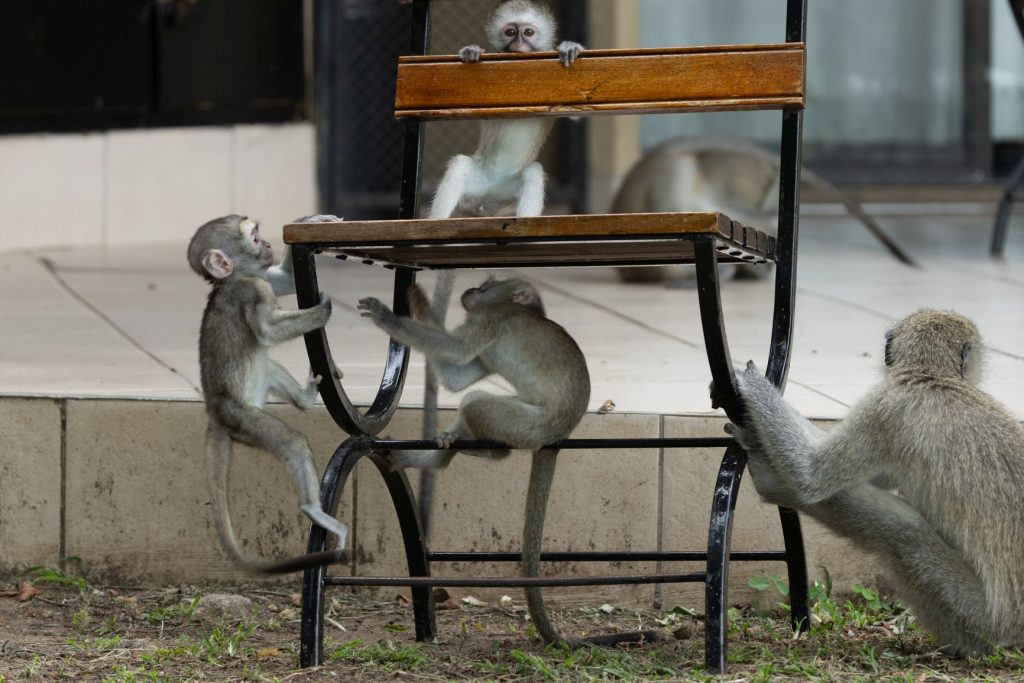 Na aankomst bij Skukuza hebben we nog even een rondje gelopen. De vervet monkeys waren druk aan het spelen rond de bungalows: