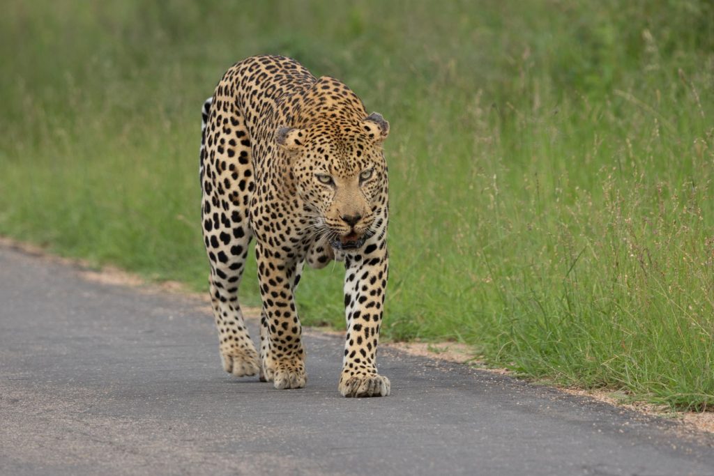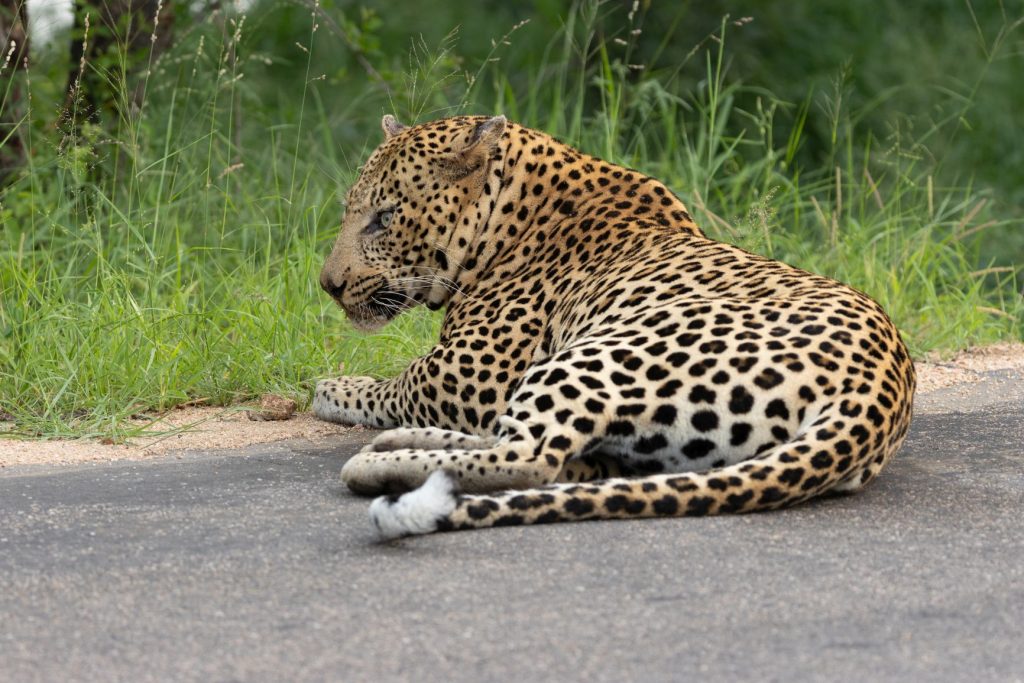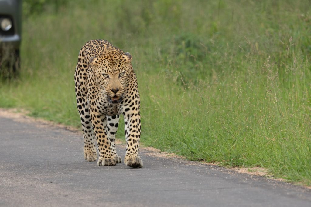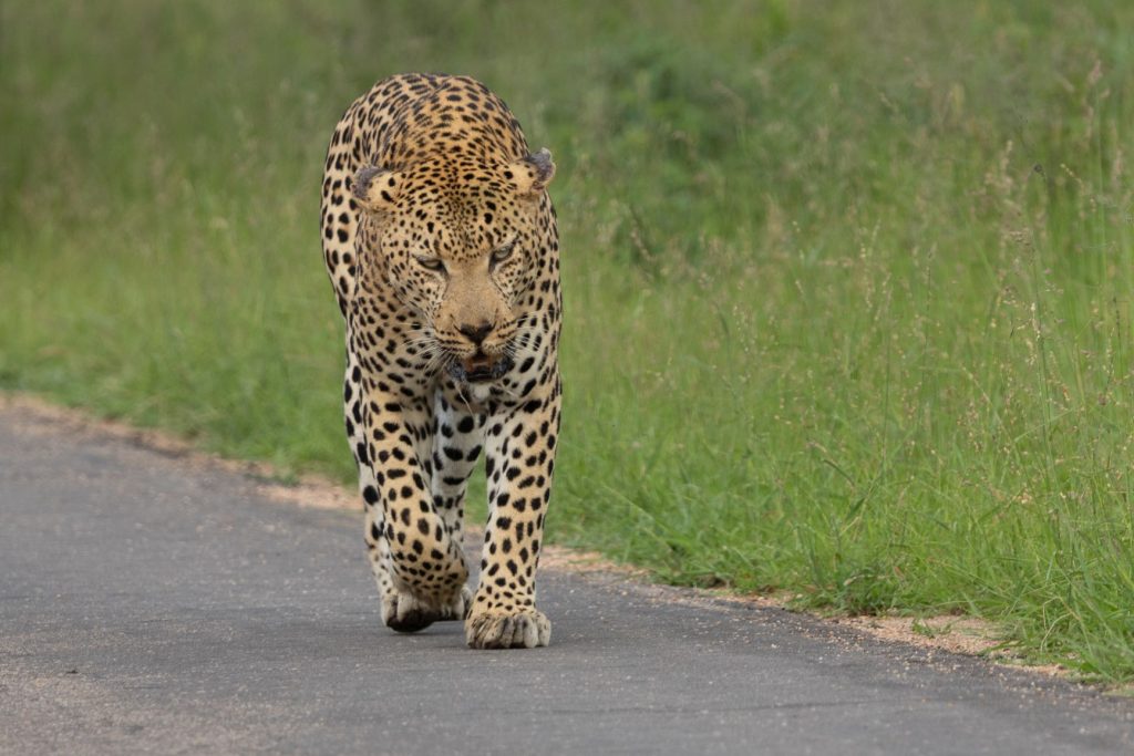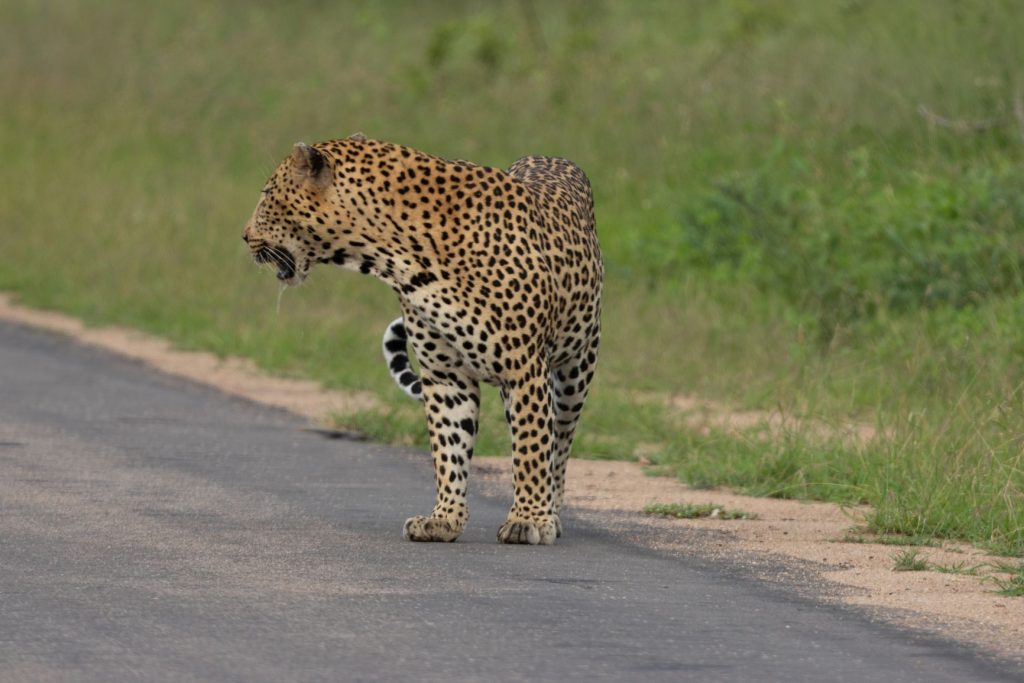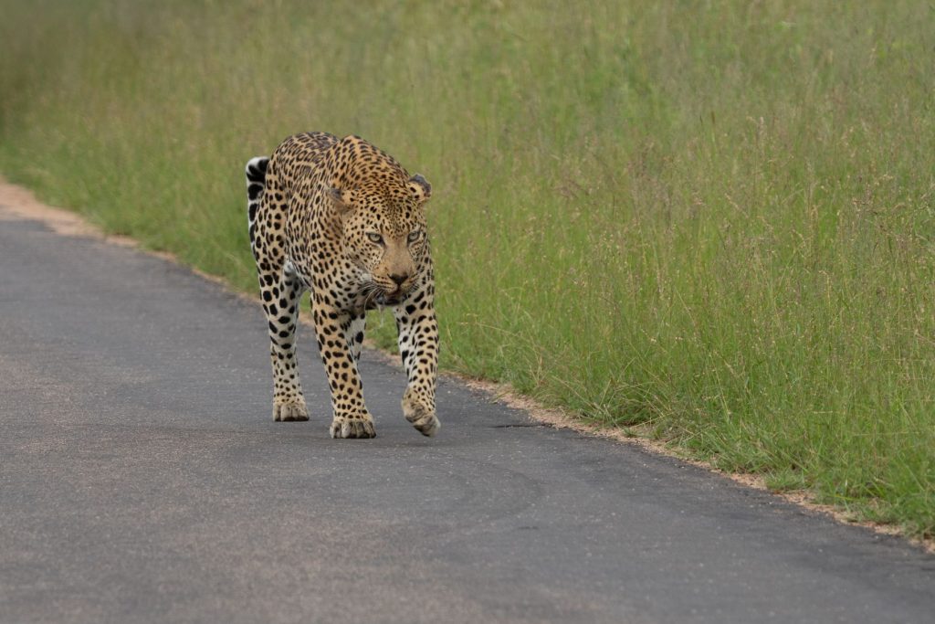 De low-water bruggen waren open, dus we konden aan het eind van de middag ons ‘normale’ Skukuza rondje rijden. En dit keer hadden we veel geluk. We kwamen eerst bij een aantal auto’s en men vertelde dat er 2 luipaarden onder de boom stonden. We hebben ze inderdaad gezien, maar het was veel te donker onder de bomen om een foto te maken. We besloten dus verder te rijden, terwijl veel auto’s bleven staan bij die 2 luipaarden. Er reden nog 2 auto’s voor ons, en opeens reden die langzaam en naast elkaar. Het bleek dat er een luipaard voor deze auto’s op de weg liep. Ze bleven naast elkaar rijden, waardoor we wel zicht hadden, maar ik eigenlijk geen goede foto’s kon maken. Ik wilde er eigenlijk voorbij, maar dat lukte eerst niet. Een OSV lukte het wel om deels via de berm aan de andere kant te komen. Het luipaard ging echter even aan de rand van de weg liggen en ik zag toen mijn kans schoon om half via de berm de auto’s voorbij te komen en ook de OSV te passeren. Ik ben een stukje verder gereden en daar gekeerd, zodat ik het luipaard van voren kon fotograferen, wat veel mooiere plaatjes oplevert. Daarbij moest ik natuurlijk hopen dat het luipaard weer op zou staan en verder lopen. En dat gebeurde inderdaad. Daardoor kon ik groot aantal mooie foto’s van voren van het luipaard maken, terwijl de rest vooral foto’s van achteren had. Ik kon ook achteruit mee terugrijden, omdat er van de andere kant (nog) geen auto’s kwamen. Na een tijdje zijn wij omgedraaid en verder gereden, we hadden inmiddels genoeg mooie foto’s kunnen maken. Zie hieronder een selektie van de foto’s.
