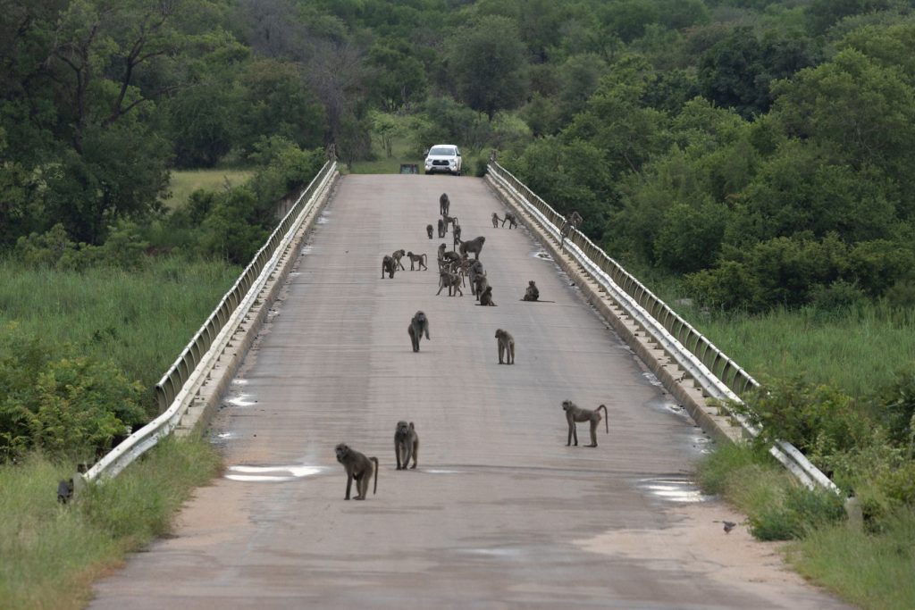 Bij de hoge brug over de Sabie rivier aangekomen, stond deze vol met bavianen (baboons).