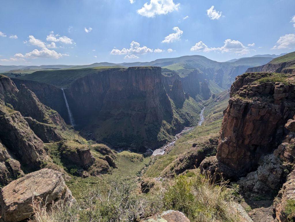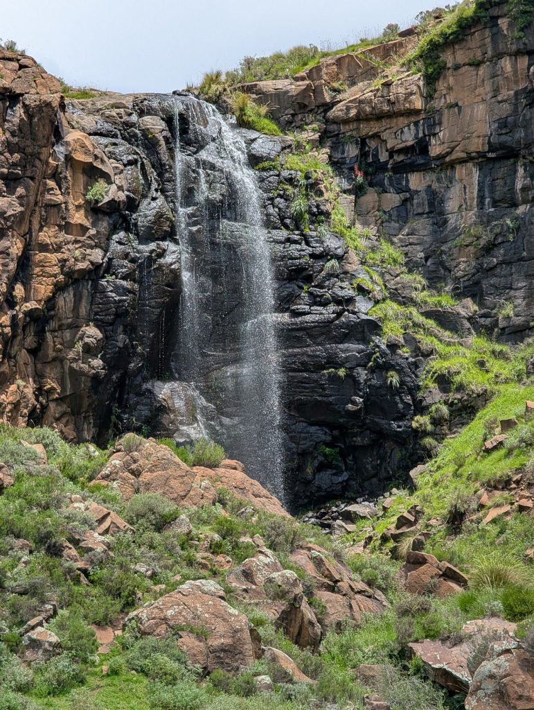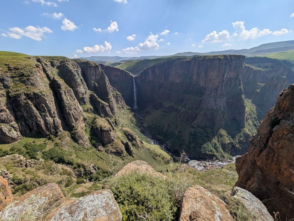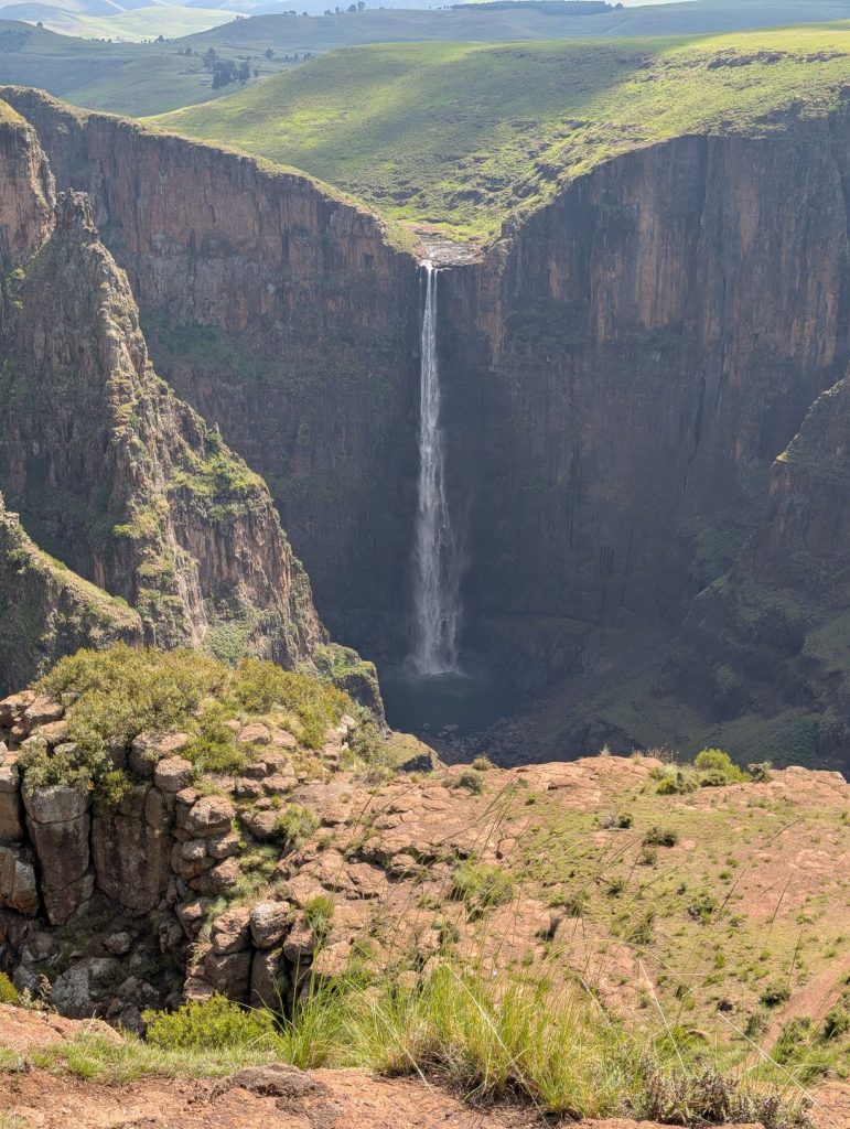 Uiteindelijk kwamen we dan toch in de buurt van de waterval. Hier stond een jongeman te wachten die ons bij zich riep om de waterval te laten zien. We wilden het eigenlijk niet, maar hij drong zich bij ons op om ons alles te laten zien. We zijn dus een stuk met hem meegelopen om de waterval te kunnen zien. Toen we echter recht voor de waterval stonden, heb ik hem wat geld gegeven en gezegd dat we alleen verder gingen. De hoeveelheid geld was niet voldoende volgens hem (hij wilde het dubbele), maar dat hebben we niet gedaan. De waterval was de Maletsunyane Falls, een van de hoogste watervallen ter wereld.