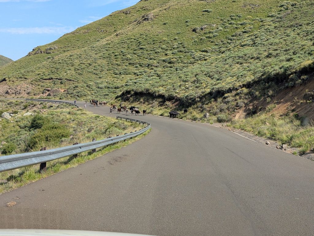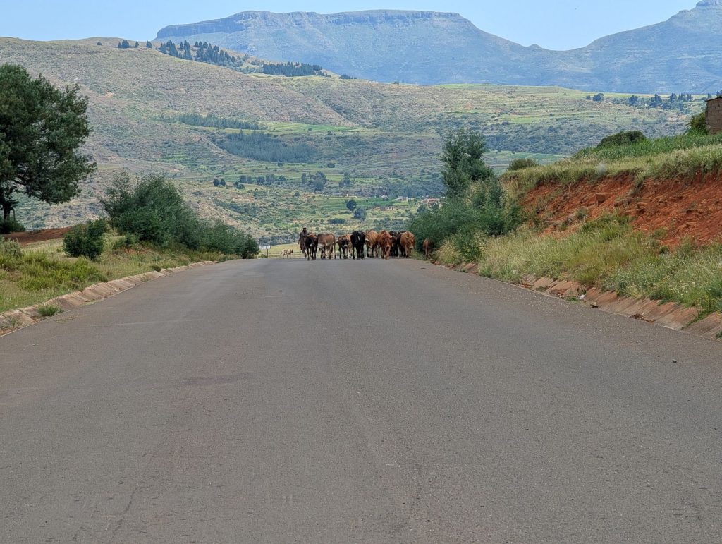 Dag 4: Na het ontbijt zijn we richting Aloes Lodge vertrokken. Dat is een rit van ongeveer 4,5 uur, weer terug naar Maseru en dan verder naar het noorden en dan oosten. Deze lodge ligt op weg naar de Katse Dam, een zeer groot stuwmeer. Daar wilden we de dag erna naartoe. Oorspronkelijk was het de bedoeling om daar te overnachten, maar de beschikbare accommodatie daar (Katse Lodge) was men aan het verbouwen en niet open. Vanaf Aloes Lodge is het nog 90 km naar de Katse dam, dichterbij kon ik zo niets geschiktst vinden. Zoals gezegd leidde de route ons eerst terug naar Maseru. Op de weg kwamen we heel veel vee tegen, dat voor ons dan aan de kant moest gaan. Zie hieronder een impressie van wat we zagen.: