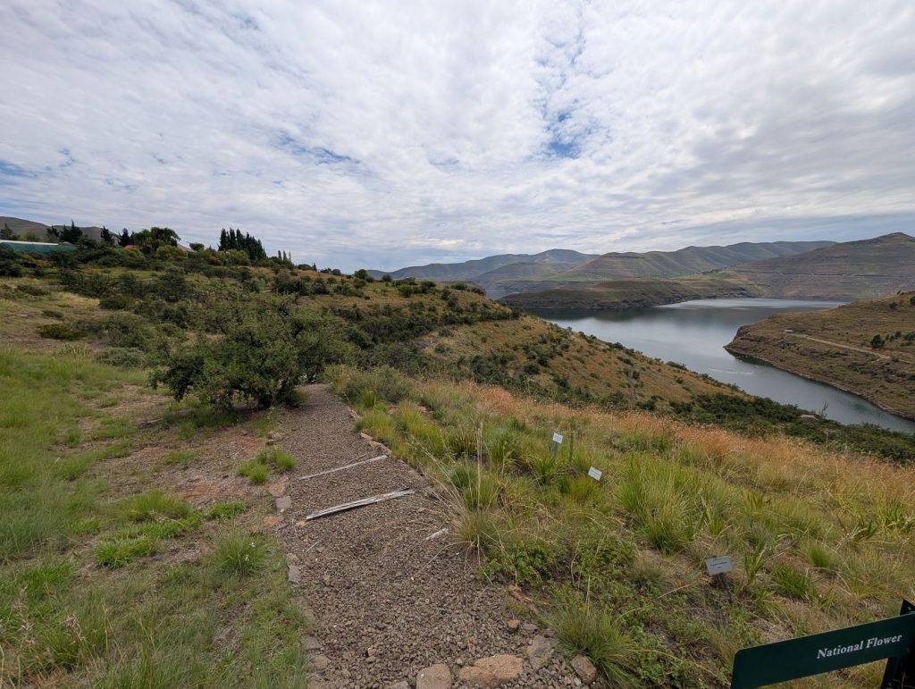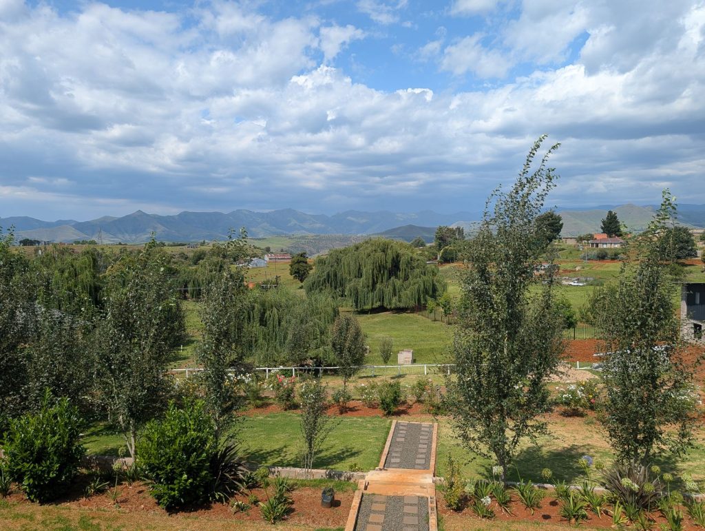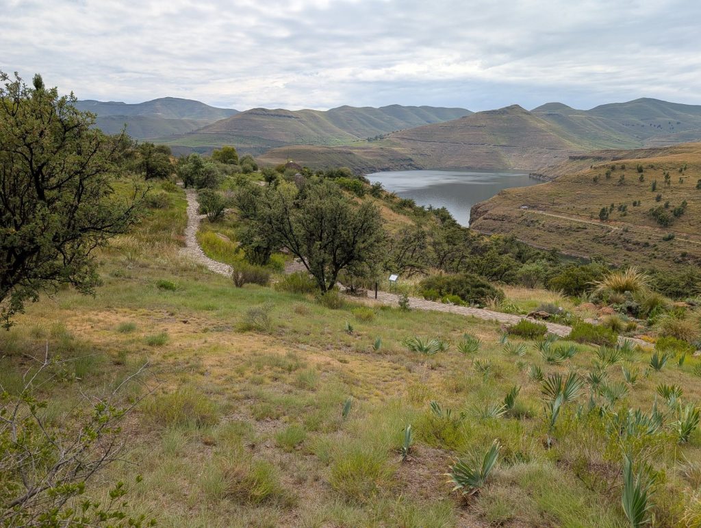 We volgen voor de route altijd Google Maps, en in de buurt van Maseru stuurde hij ons af, waardoor we weer langs Thaba Bosiu kwamen. Hier zijn we even voor een toiletstop gestopt. Maar ongeveer 10 km verder werd de weg echter een grintweg en daar hadden we weinig zin in. De hoofdweg liep verder Maseru in en daarom zijn we weer teruggekeerd en via de hoofdweg een stukje omgereden. Inmiddels moesten we ook een keer tanken en wilde ik ergens wat voor de lunch kopen. We kwamen uiteindelijk langs een tankstation met een supermarktje. We hebben allereerst getankt. De pompbediende vroeg aan het eind of wij geen werk voor hem hadden in Zuid-Afrika. Hij had 2 kinderen en geen plaats om te slapen. Dat is natuurlijk lastig voor ons en dat hebben we ook aan hem uitgelegd. Daarna zijn we de supermarkt ingegaan. Uiteindelijk bleek dat er nauwelijks iets te koop was als lunch voor mij. Ik heb uiteindelijk wat brood met rozijnen erdoor gekocht, maar het was niet bepaald een smakelijke lunch. Daarna zijn we verder gereden en rond half drie kwamen we uiteindelijk bij de lodge aan. Het bleek dat we weer de enige gasten waren in de lodge. De lodge had ook een restaurant waar we dan konden eten. We kozen een kamer boven met een wat beter uitzicht. Het was bloedheet in de kamer, maar gelukkig was er airco. Het bleek echter dat die niet bepaald goed werkte, waardoor de kamer toch een beetje warm bleef. De rest van de middag hebben we gerelaxt en tegen etenstijd gingen we naar het restaurantje. Het koste veel moeite uit te leggen wat glutenvrij is, en na het menu bestudeerd te hebben, bleek er eigenlijk maar een ding beschikbaar (braaisteak). Tineke kreeg dan dit vlees zonder marinade en met aardappelpuree, ik normaal en met frietjes. Na bijna anderhalf uur wachten kwam uiteindelijk het eten, van Tineke was het bijna koud en het vlees was zeer taai. Ze heeft het dan ook grotendeels laten staan. Mijn vlees was iets beter, maar de kwaliteit van het vlees was niet wat wij gewend zijn. Veel botten en redelijk taai. We hebben ook uitgelegd wat we nodig hebben voor het ontbijt de volgende ochtend.