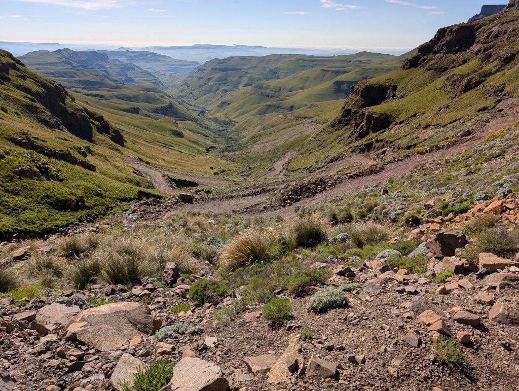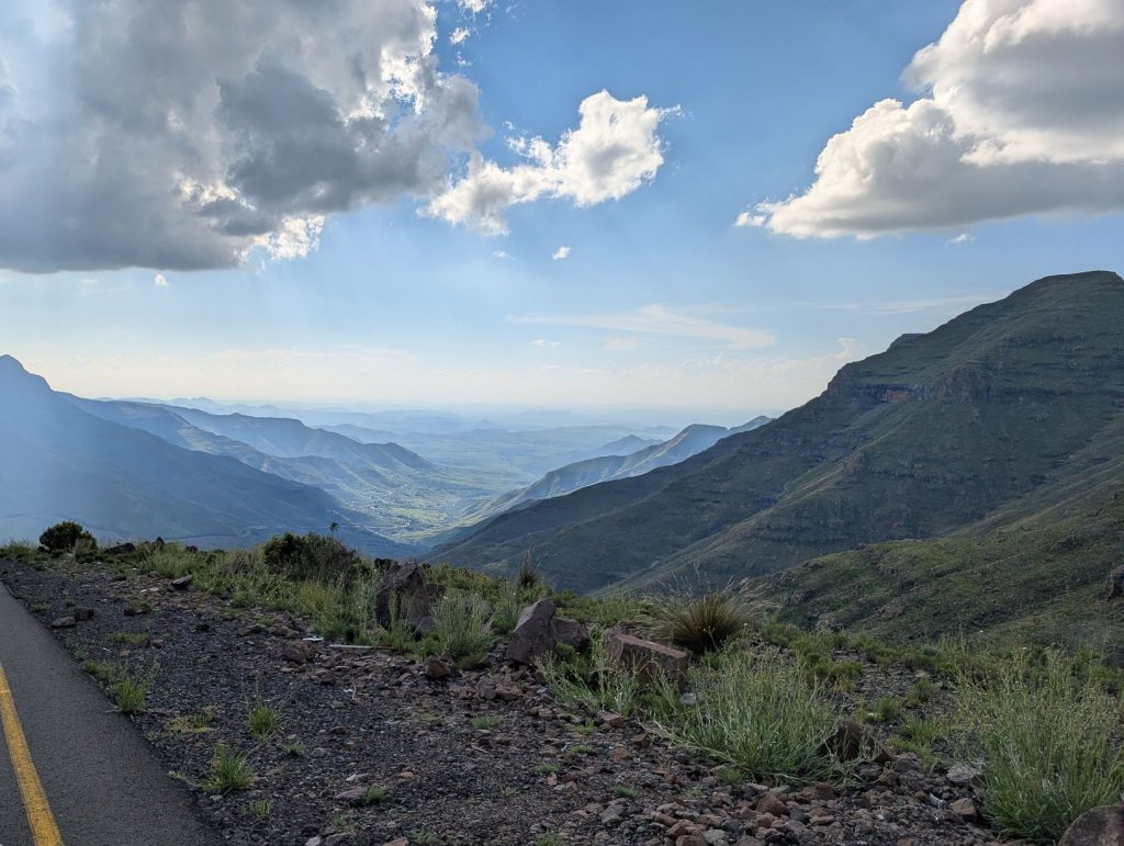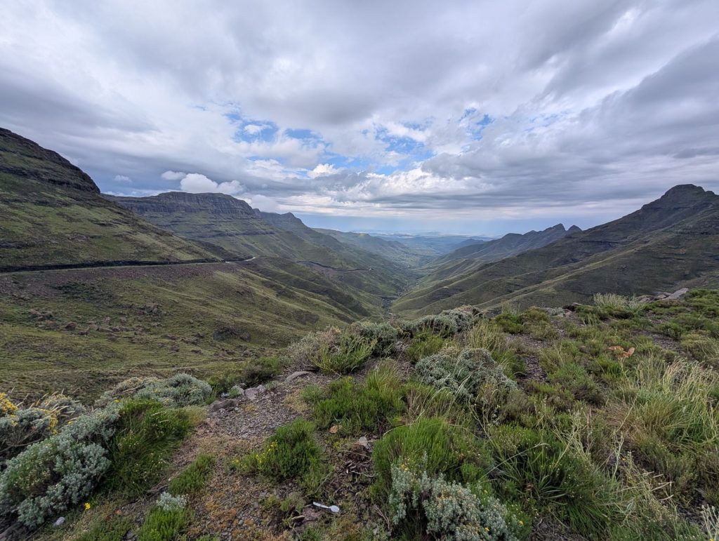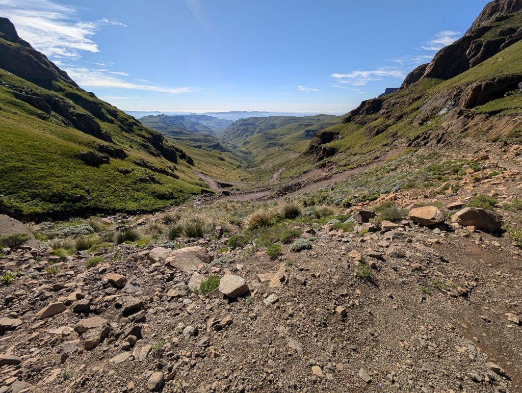 In ongeveer 50 minuten waren we bij de Zuid-Afrikaanse grenspost en ook hier gingen de formaliteiten weer erg vlot. Na deze grenspost wordt het weer een verharde weg en heb je soms nog een mooi uitzicht op de pas: