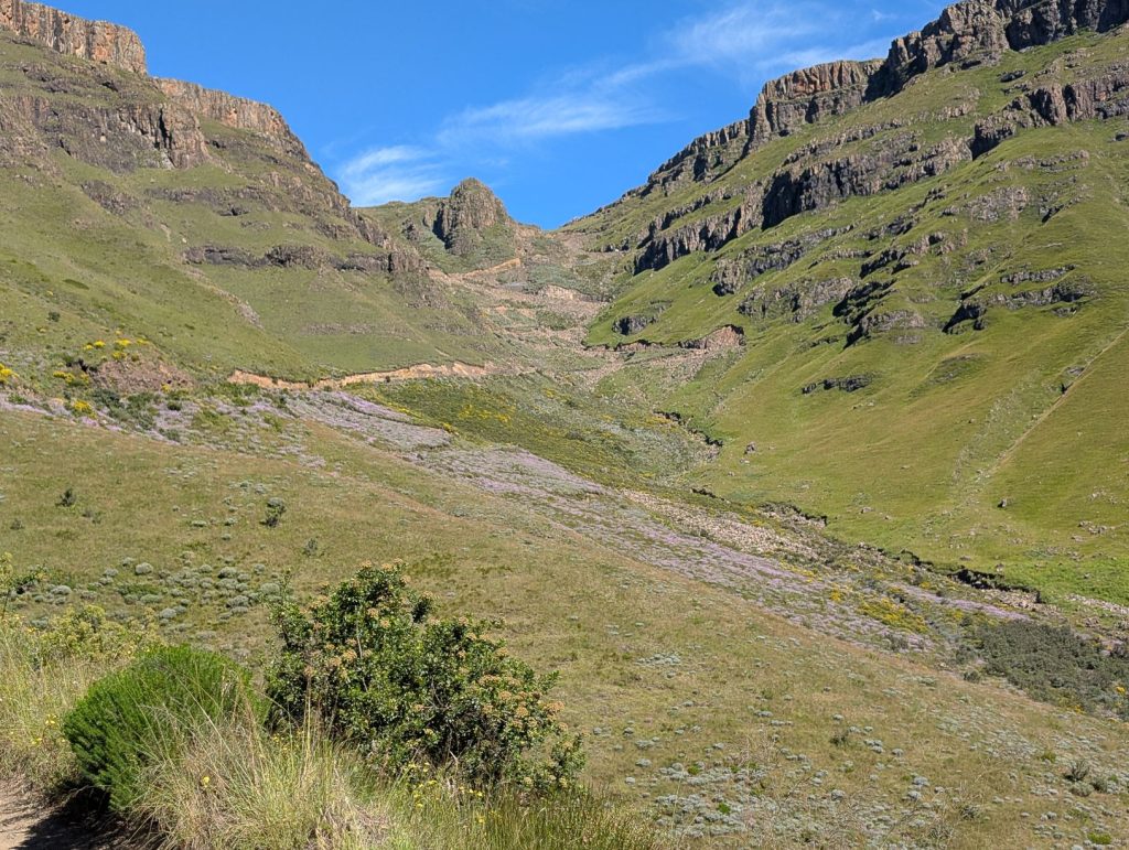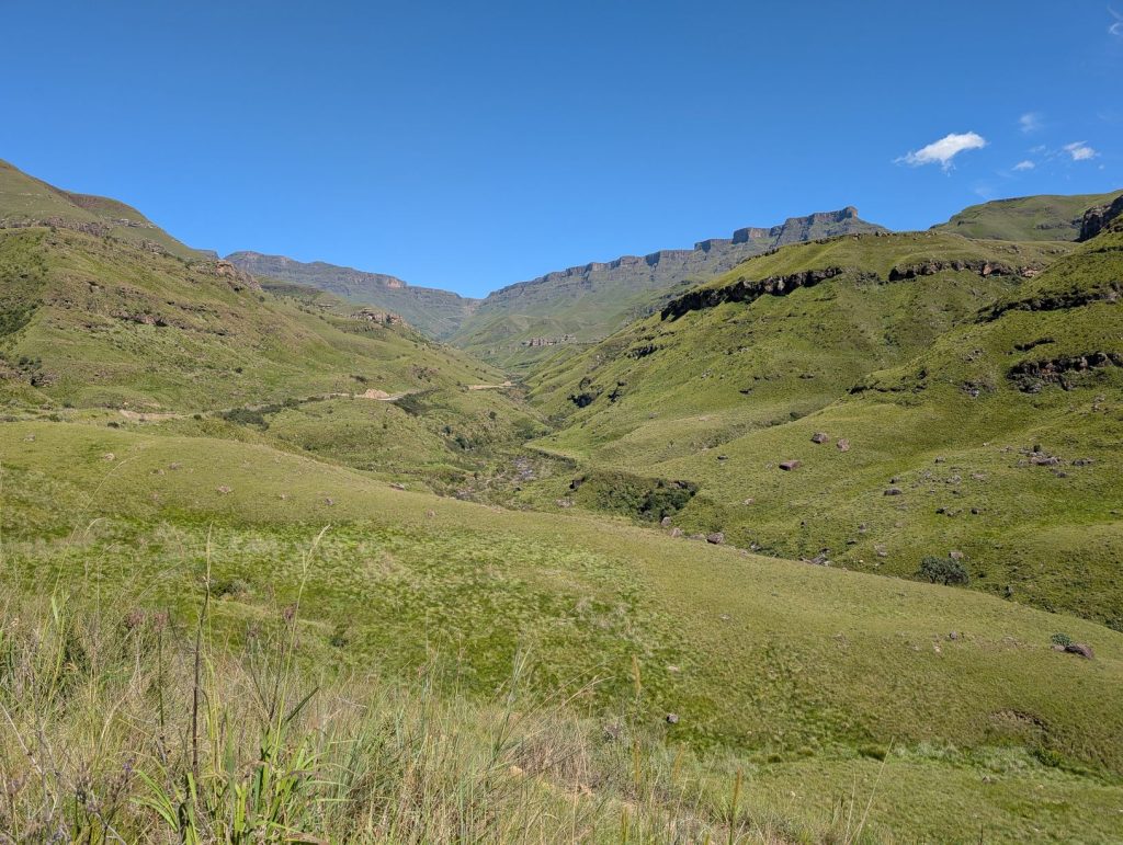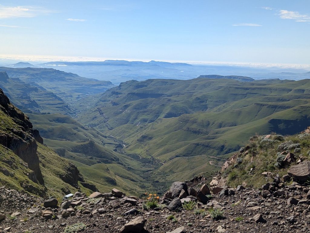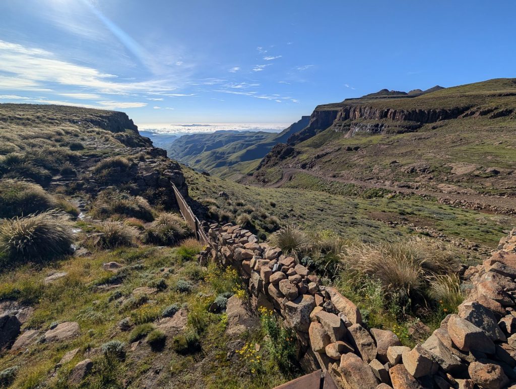 In ongeveer 50 minuten waren we bij de Zuid-Afrikaanse grenspost en ook hier gingen de formaliteiten weer erg vlot. Na deze grenspost wordt het weer een verharde weg en heb je soms nog een mooi uitzicht op de pas: