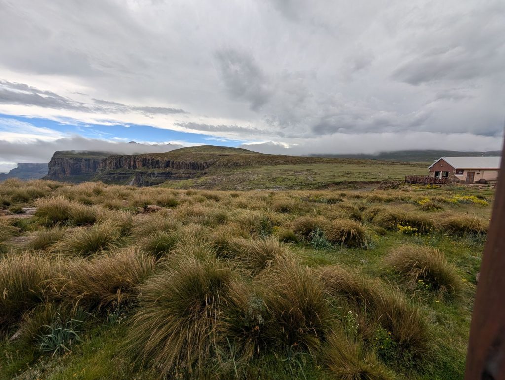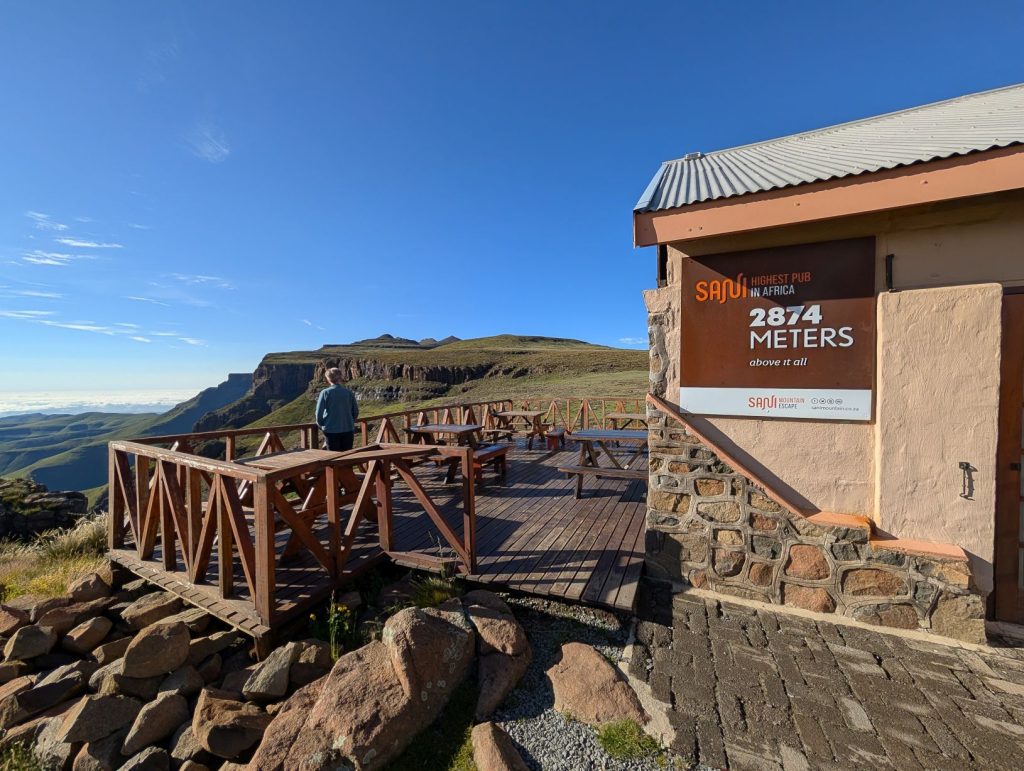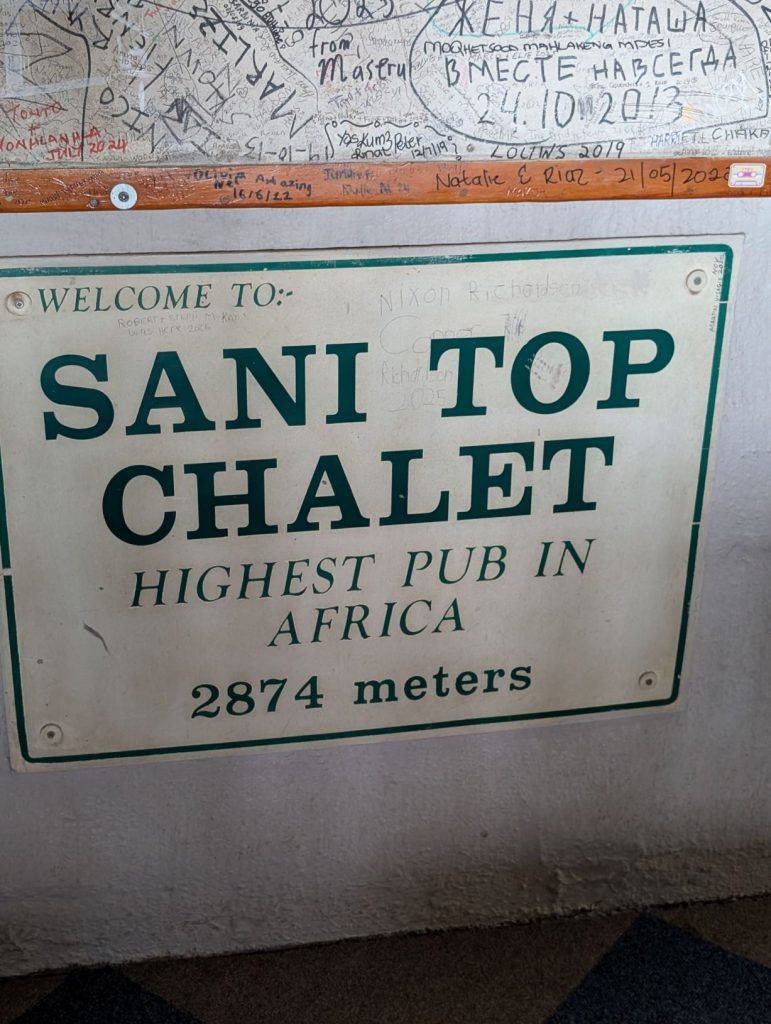 Op de laatste foto’s zie je de wolken al in de verte. Toen we uiteindelijk bij de Sanipas aankwamen, zaten we in de wolken en regen. Het regende behoorlijk toen we uit wilden stappen. Het was ook nog vroeg (13 uur) en we hadden nog niet een echte lunch gehad. We hebben daarom eerst in de Lodge (Sani Mountain Escape) geluncht en zijn daarna ingecheckt. Het bleek dat we weer de enige gasten waren. Omdat het regende en mistig was, konden we niet veel zien en doen, dus de rest van de middag hebben we vooral gerelaxt op onze kamer. Tegen het eind van de middag klaarde het iets op en zijn we naar de bar gegaan om iets te drinken en van het uitzicht te genieten (alhoewel er niet echt veel te zien was). De bar staat bekend als de hoogste bar in Afrika (op 2874 meter). We hoopten op beter weer de volgende ochtend. We hadden halfpension, dus het avondeten zat erbij. Het was ook de eerste lodge waar goed rekening werd gehouden met glutenvrij. Tineke kreeg zelfs glutenvrij brood en ook de friet was glutenvrij.