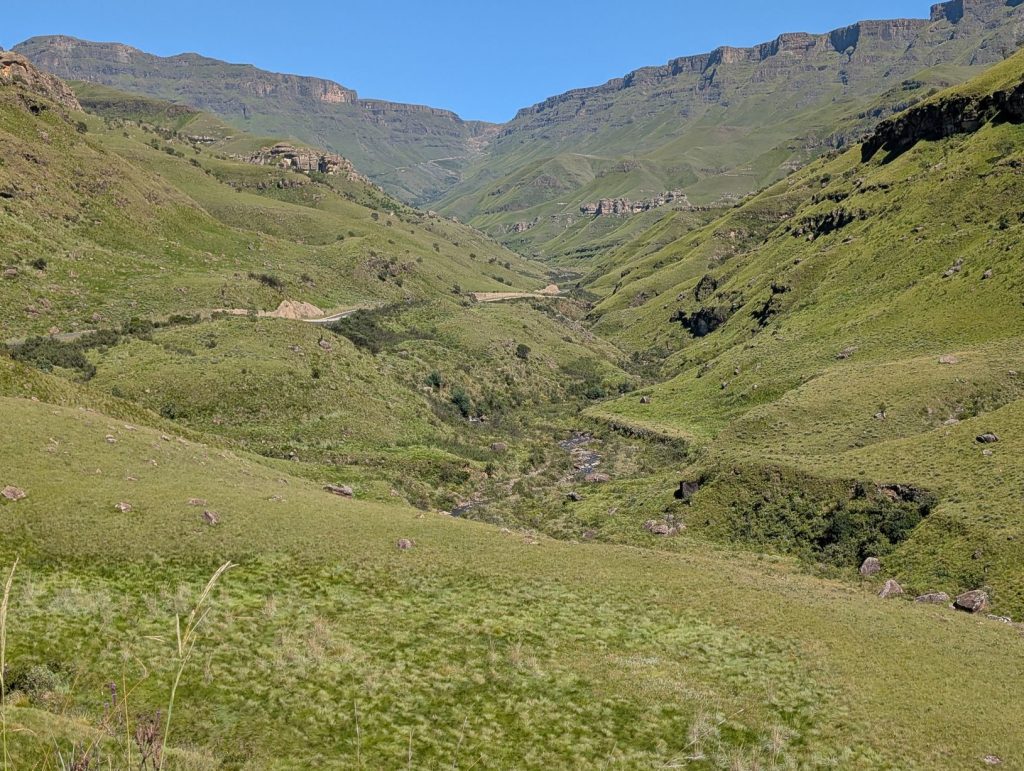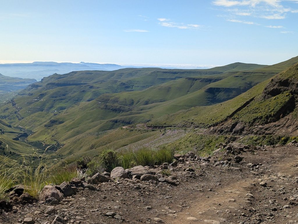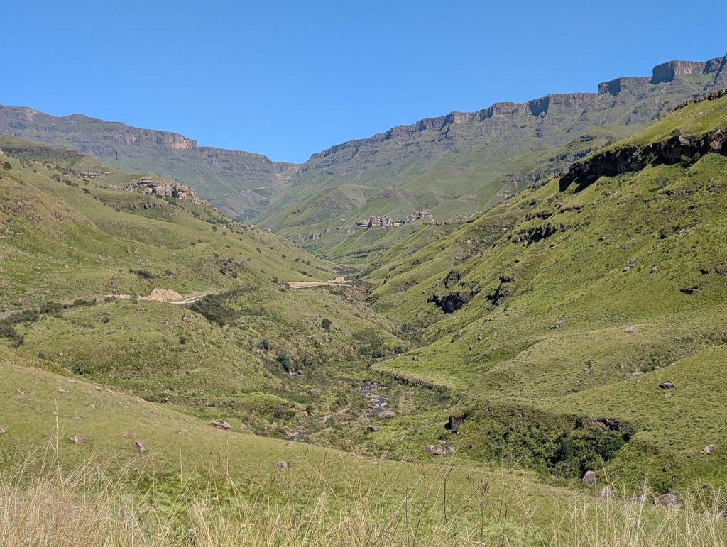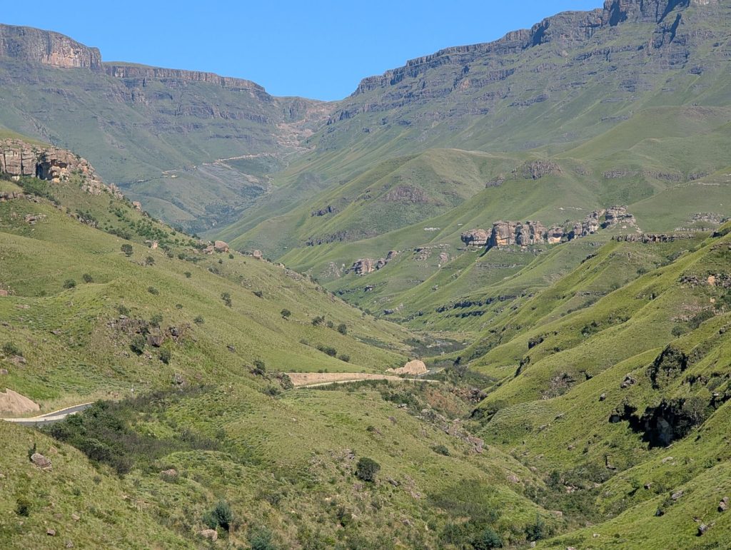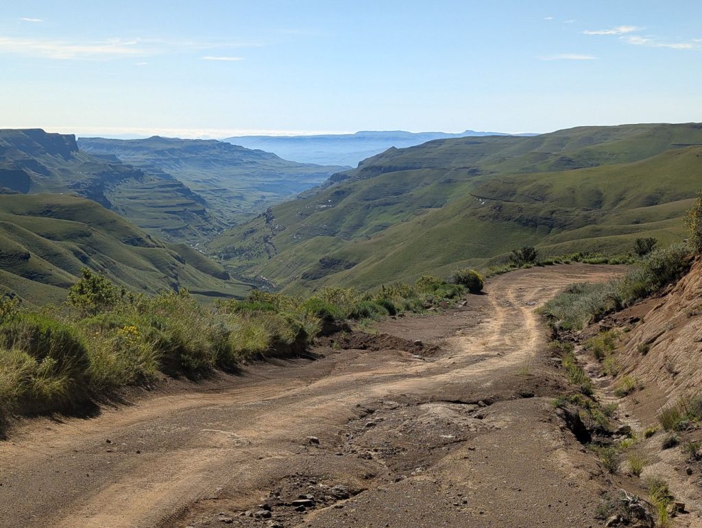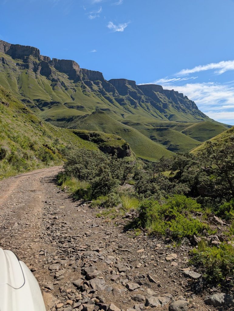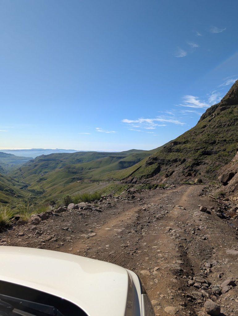 Voor de afdaling moesten we eerst de grens van Lesotho passeren. Dit ging erg vlot, ook al omdat er geen andere mensen waren. Dan kwam de echte Sanipas, met een steile afdaling over een grintweg. Deze weg is 7-8 km, waarna we bij de Zuid-Afrikaanse grenspost komen. De afdaling was inderdaad steil en rotsig, maar stapvoets goed te doen. Het is voorschrift dat je een 4×4 hebt, daarom hebben we ook deze auto gehuurd, maar naar ons idee kun je de afdaling ook wel zonder 4×4 doen. Omhoog komen trouwens ook wel taxibusjes, zonder 4×4. Onderweg was het erg rustig, we hebben maar een paar auto’s gezien. Soms moet je uitwijken, want het pad is niet altijd breed genoeg voor 2 auto’s.