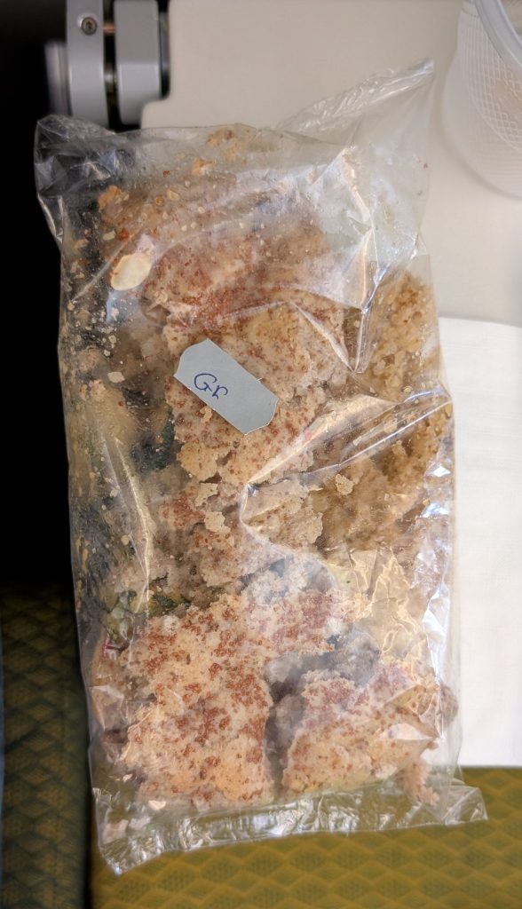 Na een lange wachttijd in de rij, het duurde steeds nogal even voor de volgende bus kwam, zijn we naar het vliegtuig gereden en aan boord gegaan. Ik had ook voor Tineke glutenvrij opgegeven voor het eten en uiteindelijk bleek dat ook wel geregistreerd. Na vertrek kregen wij een broodje geserveerd, en voor Tineke was er ook een glutenvrij broodje. Dat broodje zag er niet bepaald aantrekkelijk uit en was in meerdere stukjes gebroken, zie de foto hieronder: